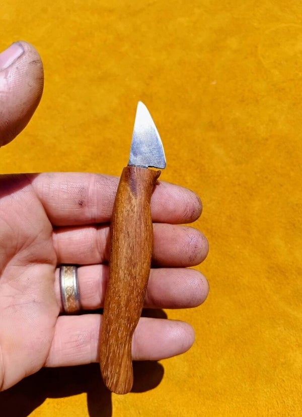 I made this small carving knife of 1095 carbon steel and Angelique hardwood. The small size allows for great detailing One of a kind exacto knife for sure