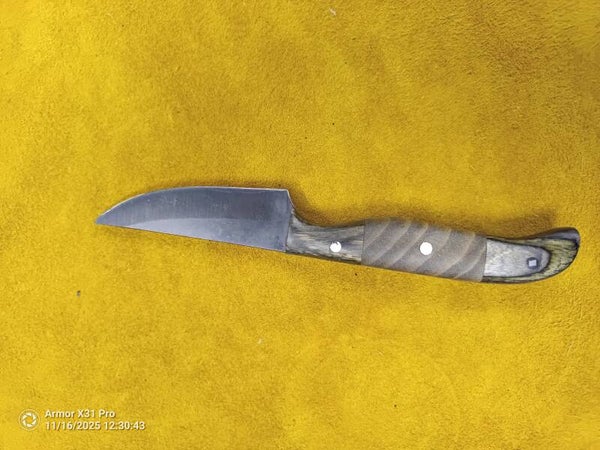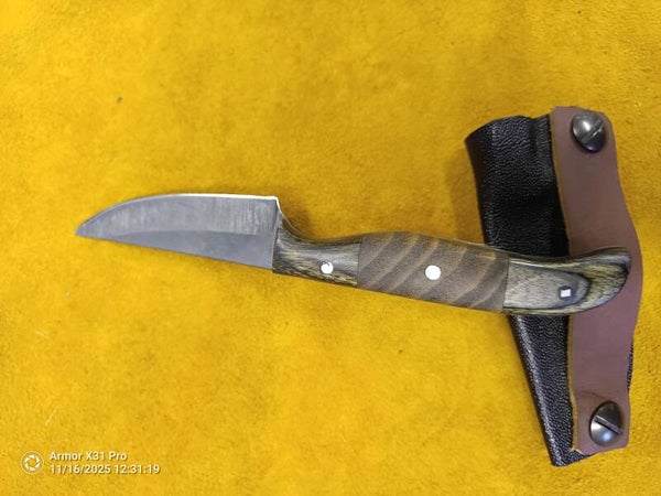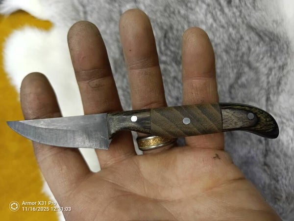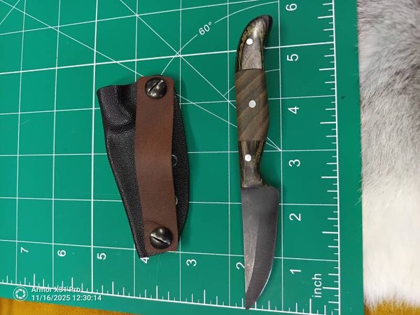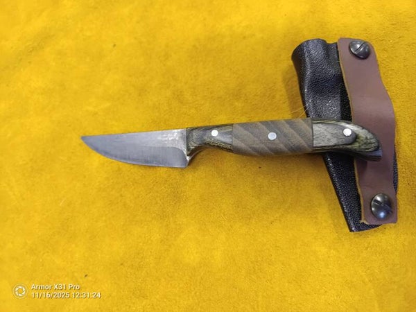I make these little knives full tang with through pins that are hand pinned then sanded flat . This one is made from nitro v stainless steel ( a German razor blade steel) the blade is acid etched a nice gun blue. the handle is silver and green laminated wood with sassafras in middle. The kydex sheath locks it in place. Comes hair shaving sharp. This knife is forged by hand and one of a kind. Shop around and see. I don't make templates so ever blade and hand sanded handle is unique.