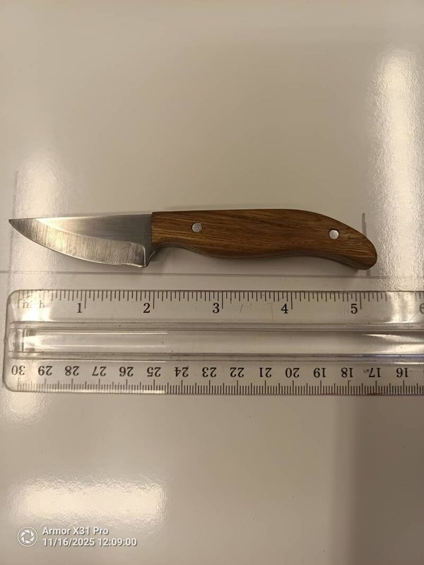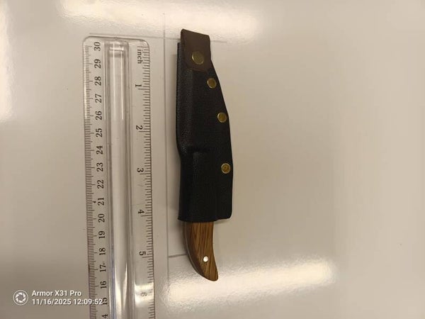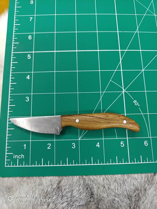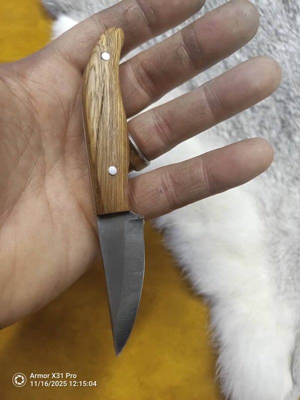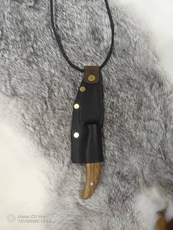 I made this knife of nitro v stainless steel with a nicely aged (200 years+) oak handle. The old oak had lots of grain to look at with several colors streaking through. The blade is acid etched gun blue and comes Razor Sharp. The kydex sheath locks it in tight. I added a leather belt loops for Left or right hand carry. And of course it can still be worn as a necklace so you always have it handy. Once again all my knives are handmade and hand sanded so they're all unique and one of a kind.
