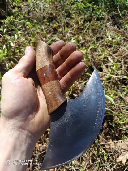 I made this Extra large ulu knife full tang and from 1061 carbon steel. The edge is razor sharp and will shave hair. The handle is made of good old Pa curly maple with a little IPA wood for contrast. Originally designed for skinning this knife will skin large game However this one works excellent in the kitchen in reverse grip or standard for cutting meats and vegetables scary easy. Just rock it back and forth to fine chop like a pro. I made a kydex sheath with leather belt loops. The sheath makes it safe to throw in a cutlery drawer. Easy to care for wash dry and wipe with olive oil. Carbon steel will patina making it even easier to care .